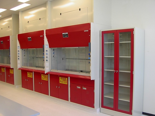 藥物存放櫃:用以儲放液態實驗試劑,如硫酸、氰化鈉、過氯酸、有機化學實驗試劑等揮發物藥物。一般為木質,也是有鋼質,可儲放規格型號不一樣的實驗試劑。木櫃規定牢固,可以並列應用,還可以與路麵牆麵固定不動。
